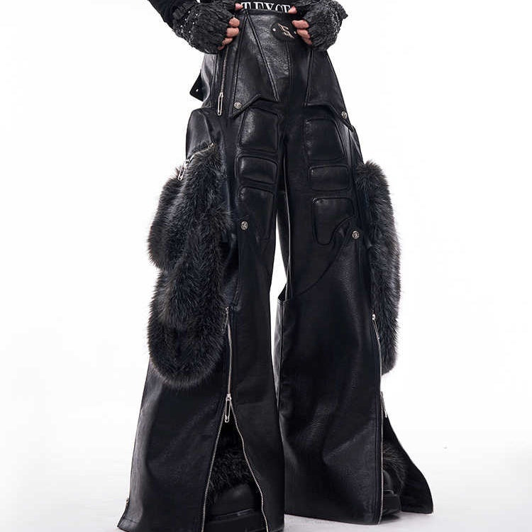 Big Horn Pants Exquisite Korean Style Stitching PU Leather Design Fur